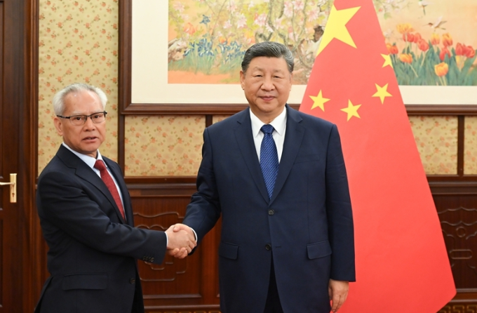 12月16日,国家主席习近平在中南海会见来京述职的澳门特别行政区行政长官岑浩辉。新华社记者 殷博古 摄